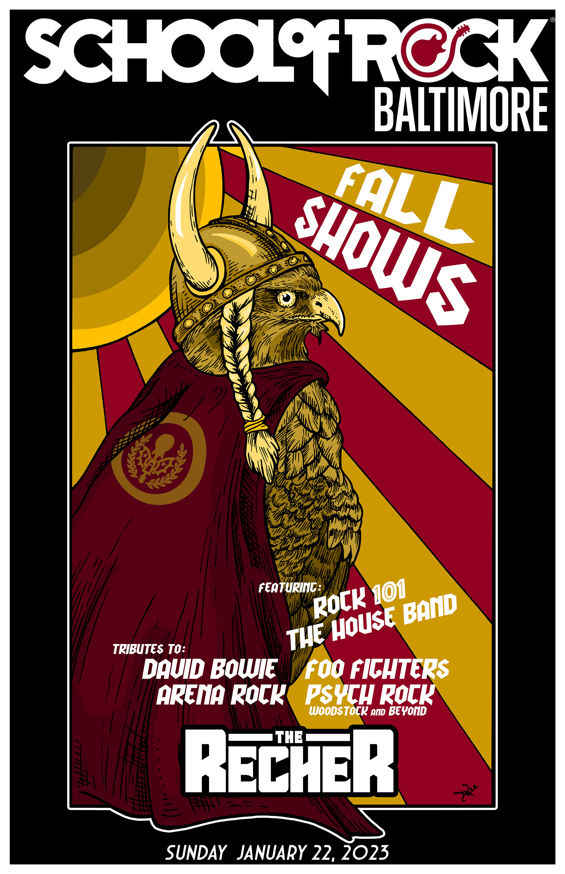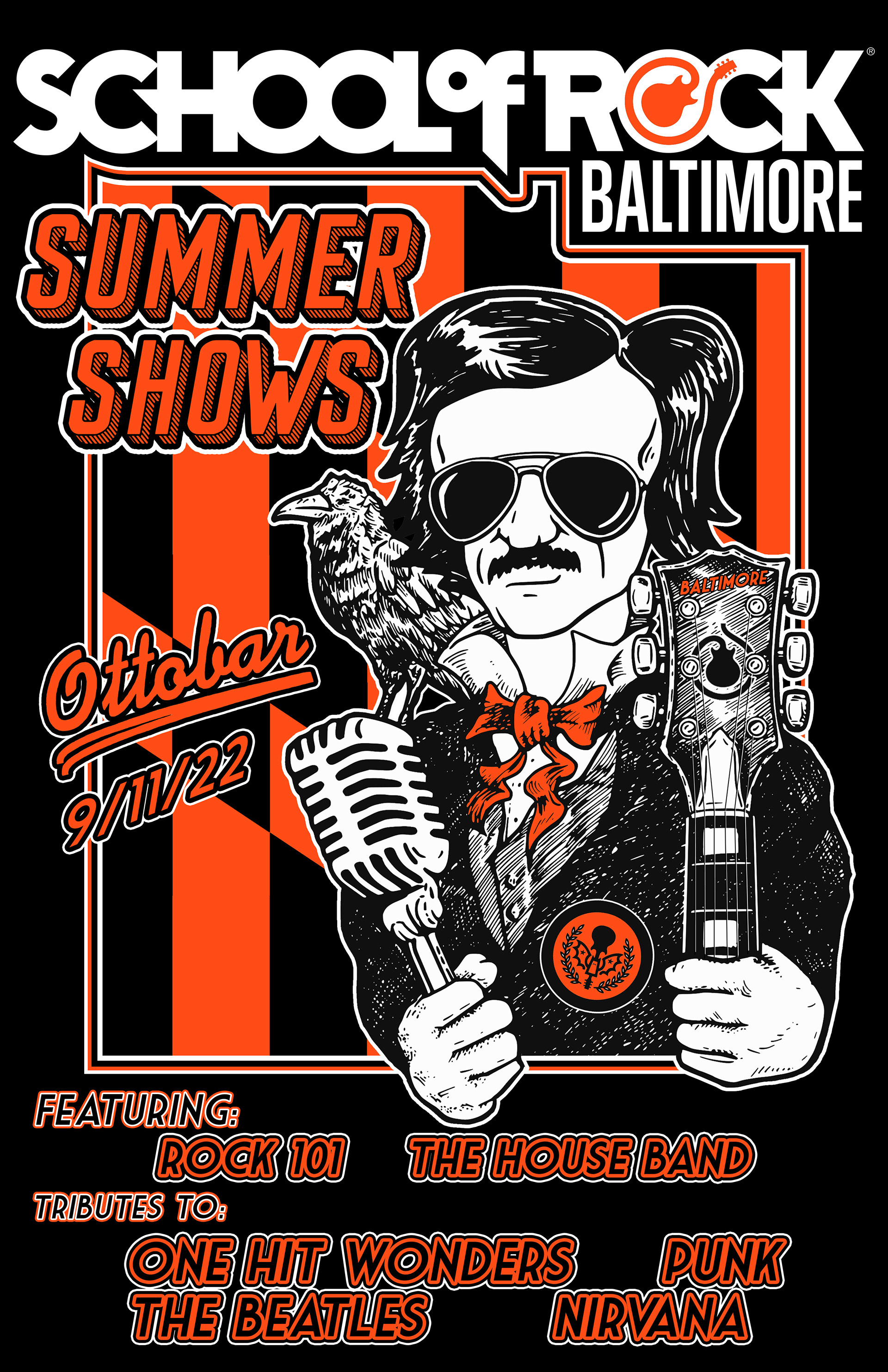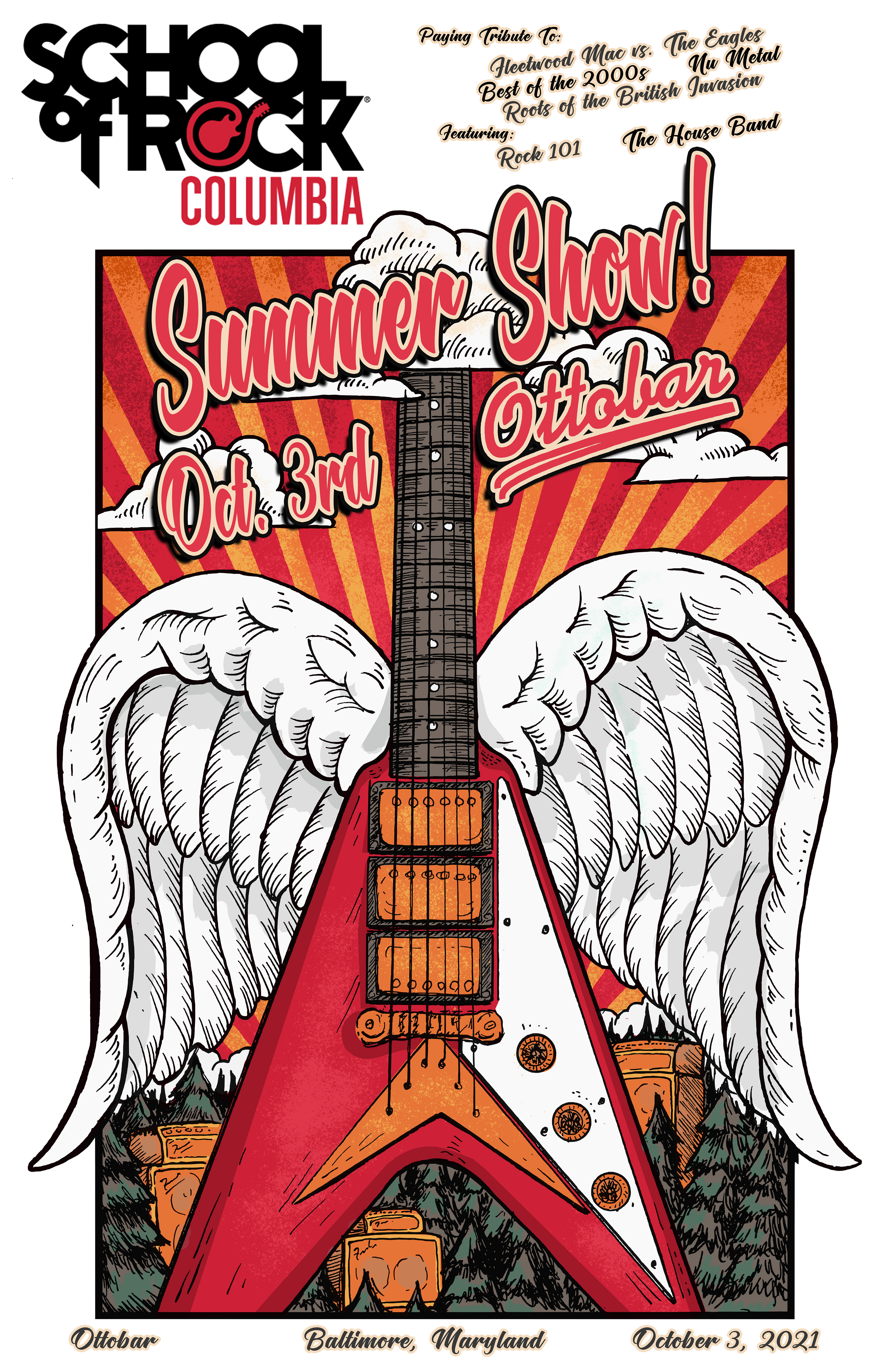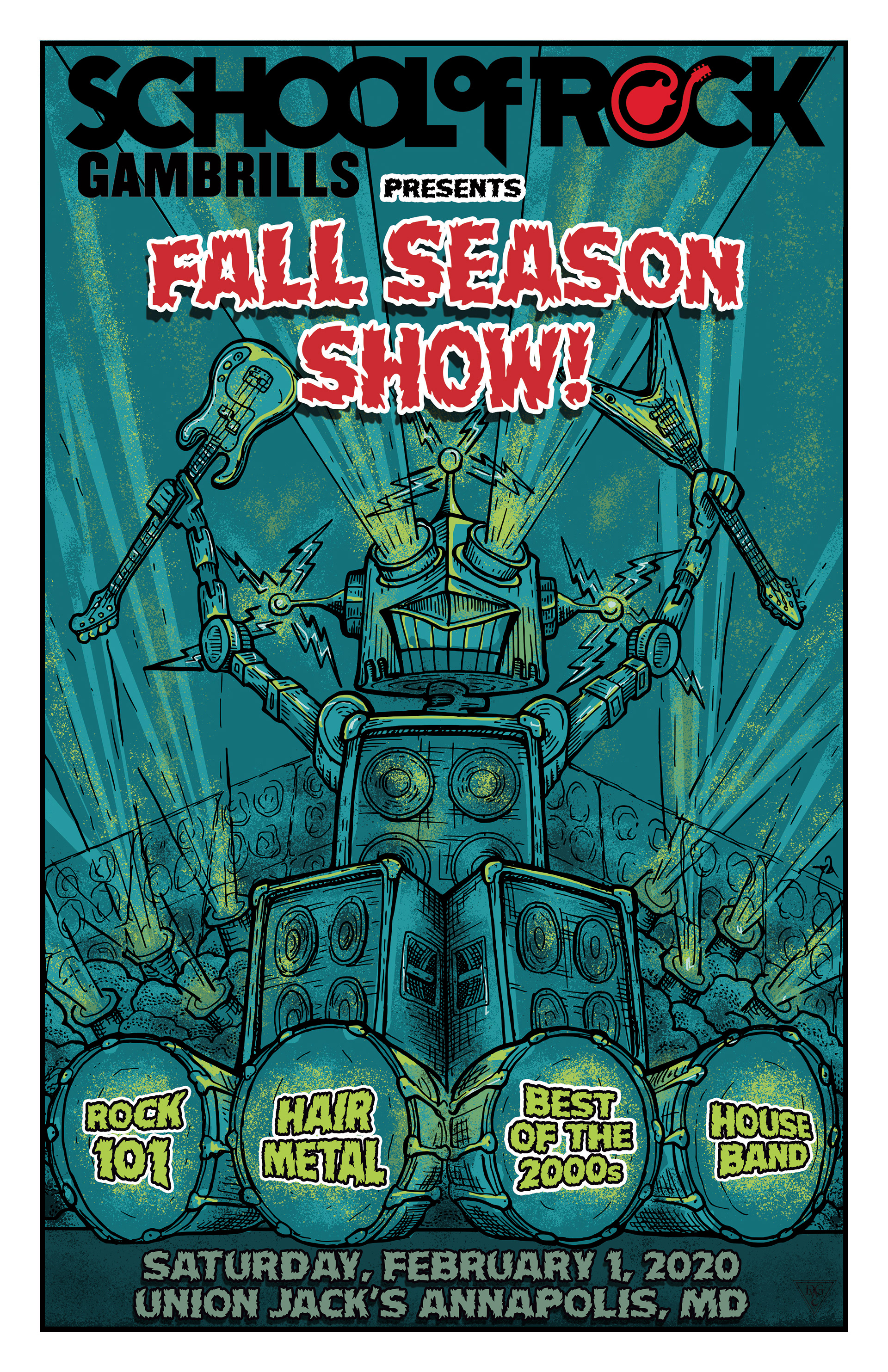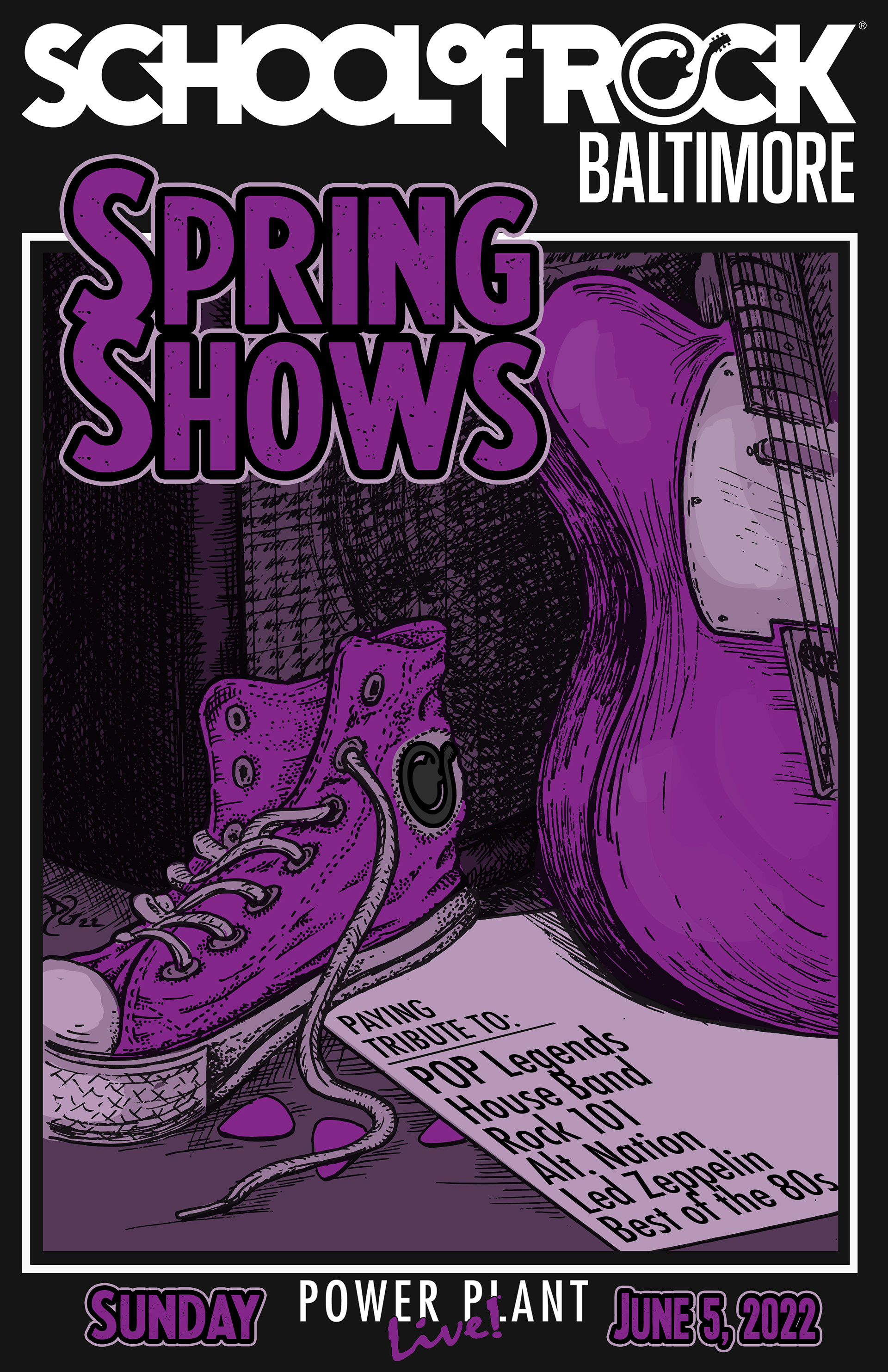 Poster Art and layout for student showcase gigs for School of Rock Baltimore, Columbia and Gambrills. Design work begins with hand drawn artwork and is completed and edited digitally.