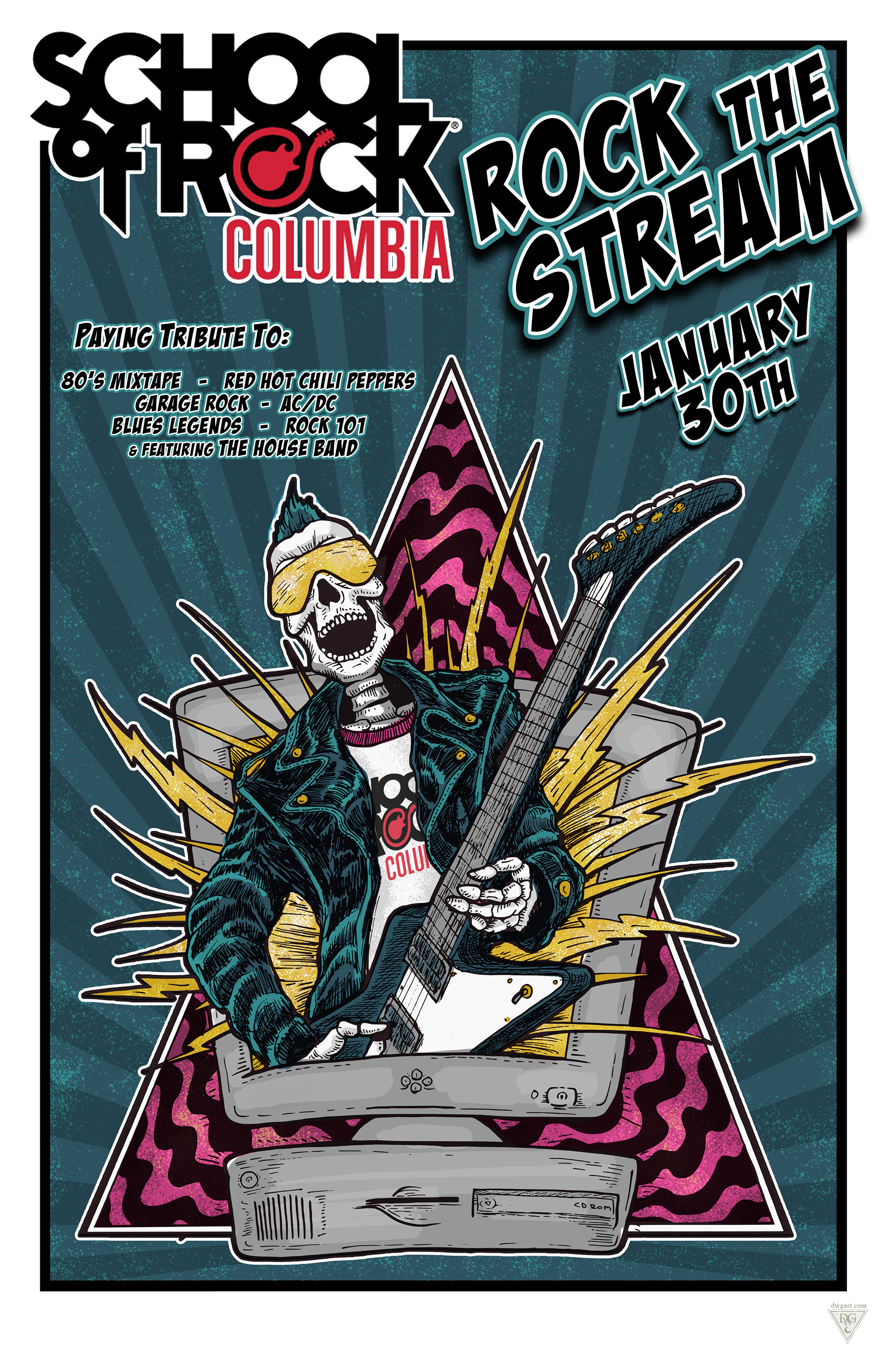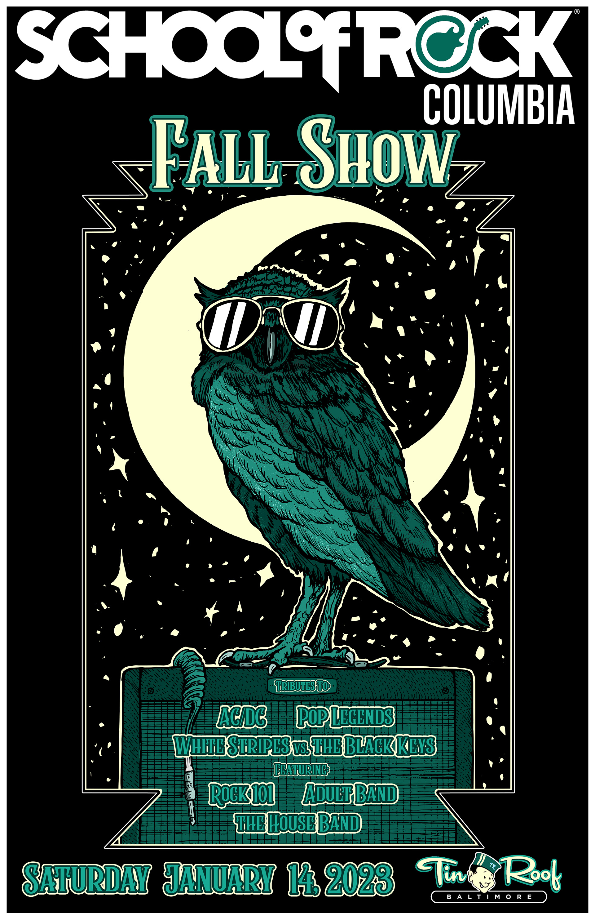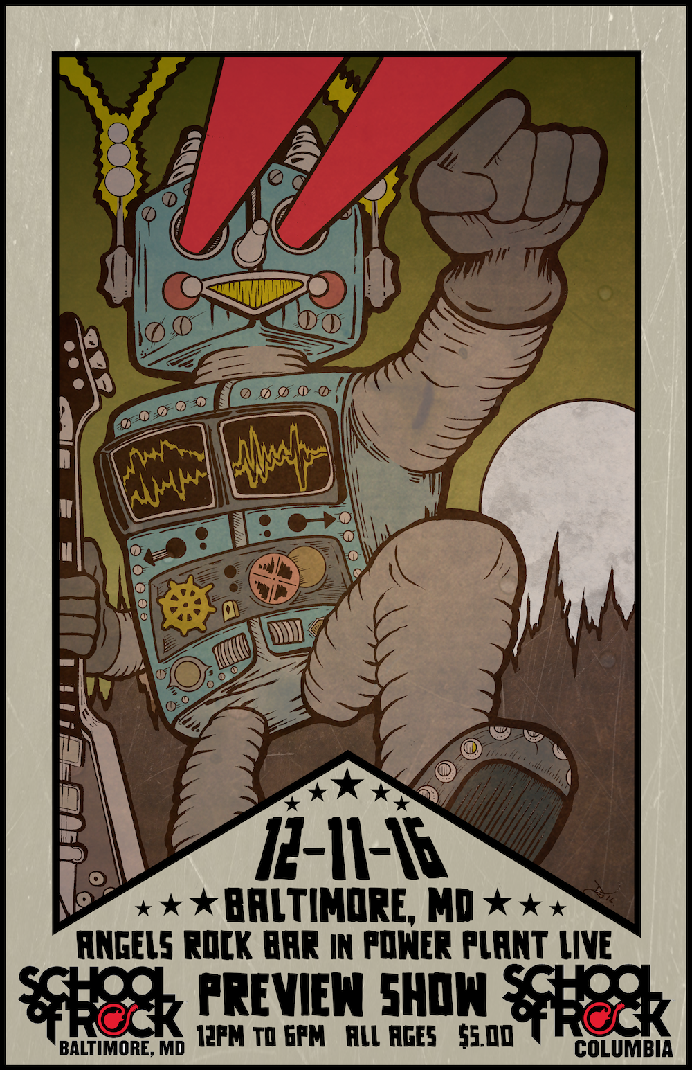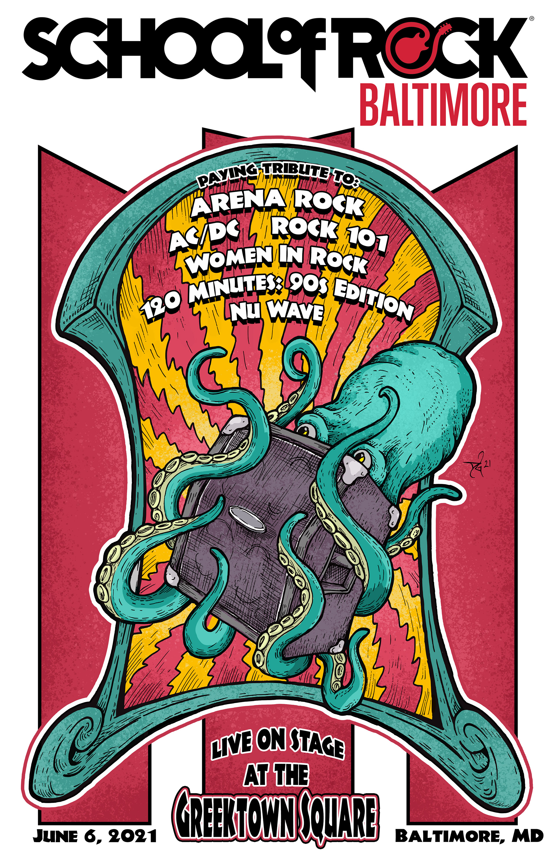 Poster Art and layout for student showcase gigs for School of Rock Baltimore, Columbia and Gambrills. Design work begins with hand drawn artwork and is completed and edited digitally.