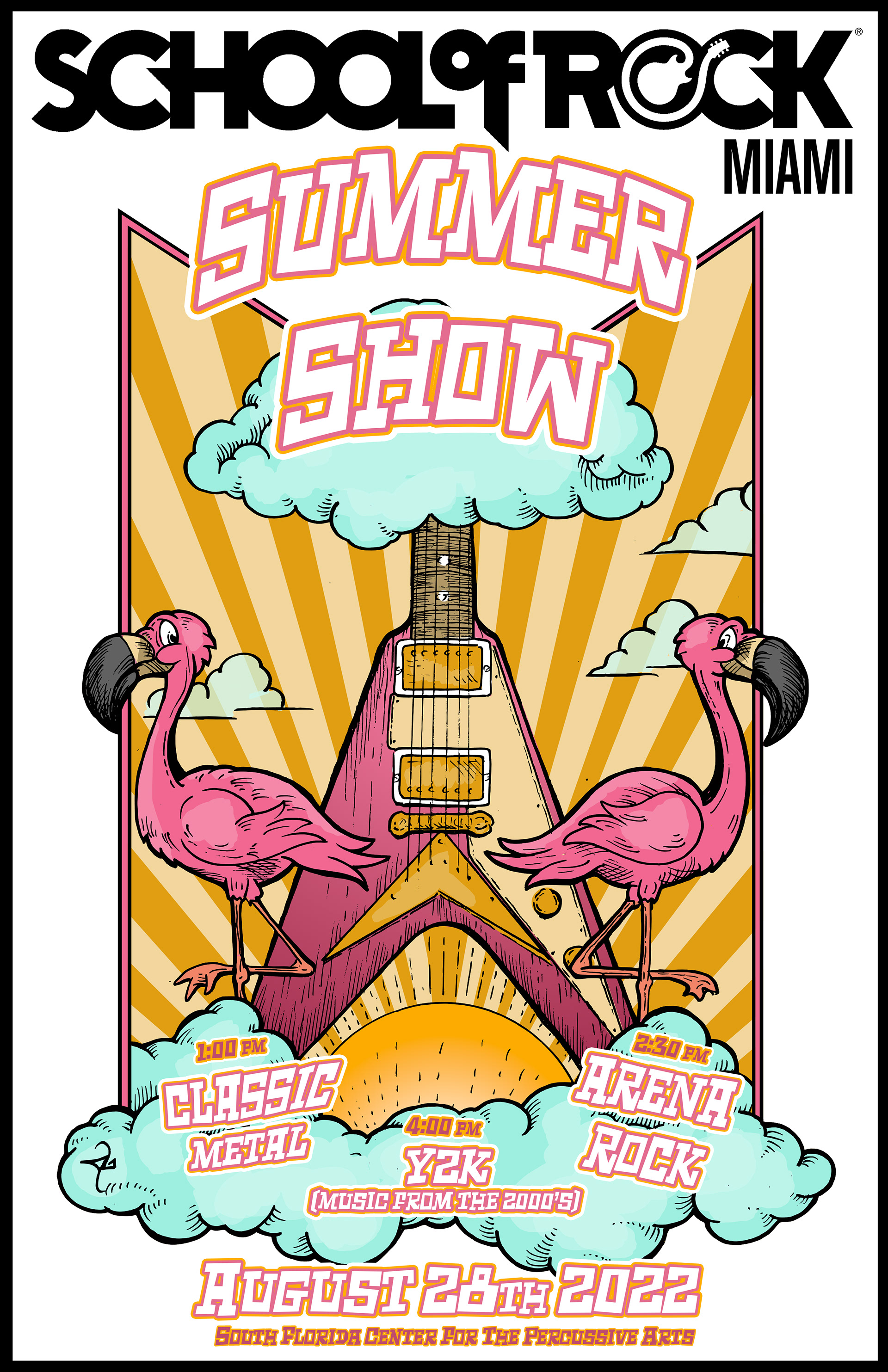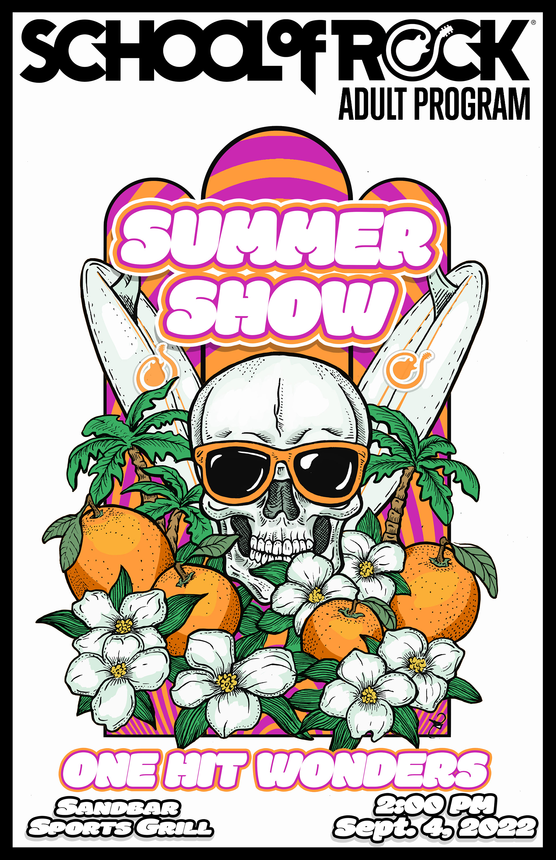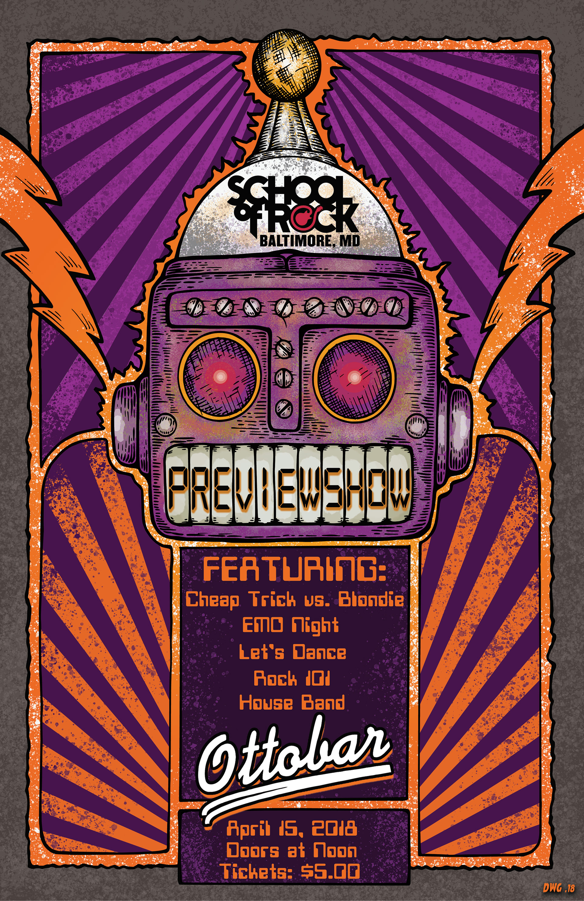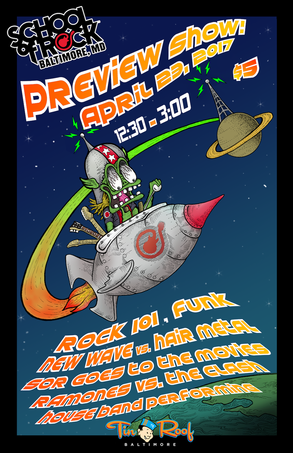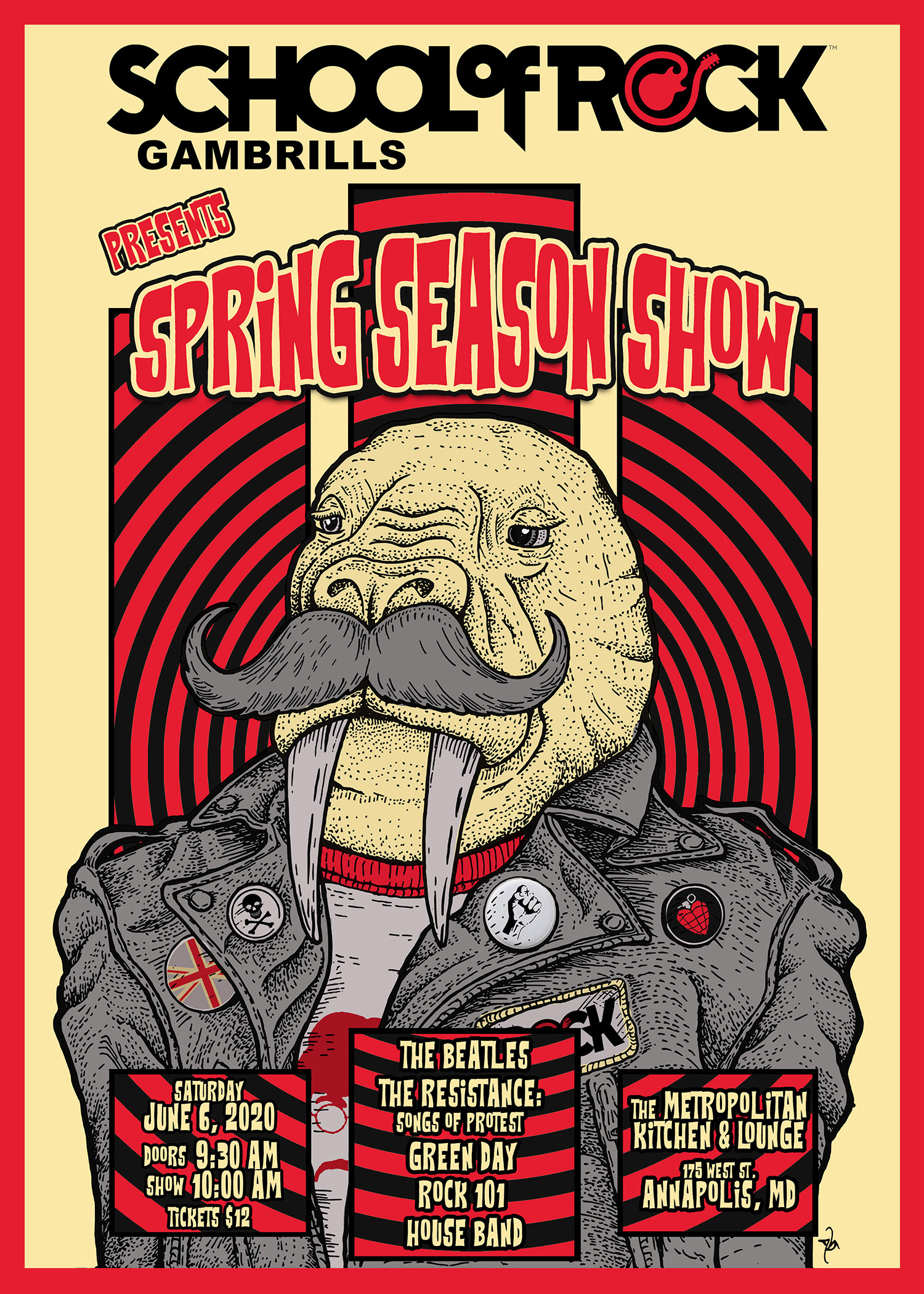 Poster Art and layout for student showcase gigs for School of Rock Baltimore, Columbia and Gambrills. Design work begins with hand drawn artwork and is completed and edited digitally.